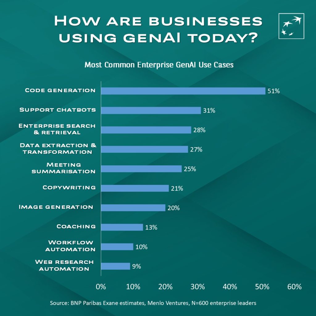 Several examples of how responsible AI is used by companies are provided in the report. Obvious examples include code generation, which is the most common use case, as well as support chatbots, data extraction, meeting summarisation, and image generation.
