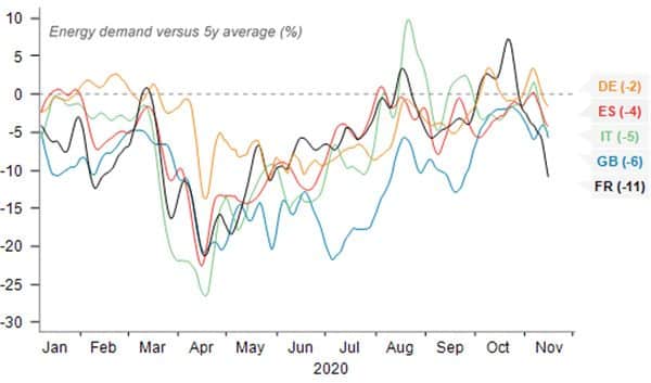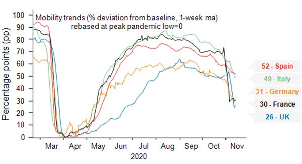 Against this backdrop, the global economy is set to slow into the year end as output contracts again in countries with renewed lockdowns and given the scope for data to disappoint expectations, although BNP Paribas alternative data analysis, such as mobility and energy demand, suggests the drag will be smaller than in the wake of the first Covid-19 wave (see figures). The prominent exception is China, which has already returned to above pre-pandemic levels, though it is still below the pre-crisis trend.