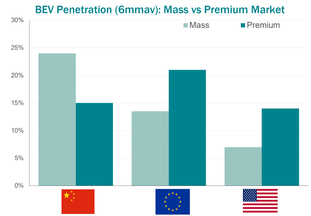 Two markets, China and Europe, account for 80% of the world’s EV sales. China on its own has just under a 60% share, as the country continues to lead the way in the shift away from ICE. Nearly a third of the vehicles sold in the country are BEVs.
